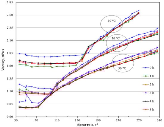 The influence of sonication time (5–1355 min) on the κ, μ, shear stress, average cluster size, and CNT length of 0.5 wt% MWCNT/EG + 0.25 wt% GA NF were studied [163]. Increasing the sonication time causes the reduction of μ, average cluster size, and CNT length and an increase in κ of the NF. At 1355 min of sonication, maximum κ (23%), minimum μ, lowest average cluster size, and CNT length are recorded owing to optimum stability conditions. The use of the continuous mode of sonication is observed to produce a slightly higher κ than the pulse mode. Figure 8 shows the impact of μ on the shear rate at different sonication times. The influence of aggregate size, sonication time, and temperature on the stability and μ of EG-based Cu NF was examined [164]. Stirring is carried out for 20 min, while sonication took 15–75 min at temperatures of 20–50 °C. Generally, a sonication time increase causes a reduction in the μ value of the MNF, which enhances with a further increase in the sonication time after reaching the lowest μ, while a sonication temperature increase lowers the viscosity of the MNF. Increasing the sonication temperature and time is found to reduce the aggregate size of the NF due to an increase in Brownian motion. At low weight concentrations (1 and 2 wt%), the lowest μ values are obtained at an optimum sonication time of 60 min. However, for 3.8 wt% NF, the lowest μ is attained at an optimum sonication time of 45 min.