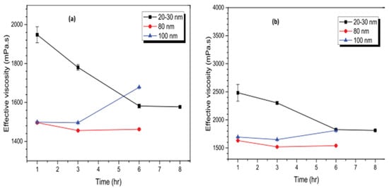 The μ behavior of Al2O3/GL NFs under different volume fractions (1–5%), sonication energy densities (5 × 106–4 × 107 kJ/m3), nano-sizes (20–30, 80, and 100 nm), and sonication time (1–8 h) was investigated [74]. The stability is monitored using UV, ZP, and visual inspection techniques. The results demonstrate that the μ of Al2O3/GL NFs reduces with the sonication time (irrespective of volume fraction) to an optimal value and thereafter increases as the sonication time increases. Stable Al2O3/GL NFs are achieved by sonicating 20–30 nm-sized Al2O3/GL NFs for 6 h and 80 nm and 100 nm-sized Al2O3/GL NFs for 3 h. The sonication time of Al2O3 (20–30 nm)/GL NFs corresponds to the energy density of 3 × 107 kJ/m3, while that of Al2O3 (80 and 100 nm)/GL NFs amounts to 1.5 × 107 kJ/m3. An increase in the sonication energy density is noticed to cause a significant reduction in the average particle size. At optimum stable conditions, the MNFs have a pH, ZP, and particle size of 6.44, −504 mV, and 59.6 nm, 6.26, −244 mV, and 128.7 nm, and 4.09, −79 mV, and 118.0 nm for 20–30 nm, 80 nm, and 100 nm-sized Al2O3/GL NFs, respectively. Moreover, at the optimum stability state, the Al2O3 (20–30 nm)/GL NFs are observed to exhibit the highest μ leading to a higher sonication energy density. Figure 9 presents the effect of sonication time on the viscosity of MNFs with different nano-sizes.
