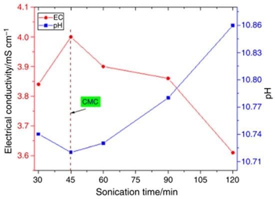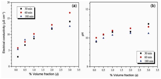 Influence of sonication time on the electrical conductivity and pH of MgO-EG NF at 20 °C: (a) electrical conductivity and (b) pH. Adapted from [120].