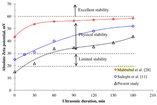 Effect of ultrasonic duration on zeta potentials of TiO2—H2O NF. Adapted from [124].