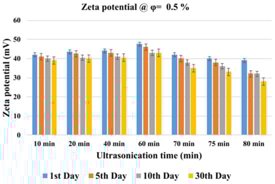 The impact of the sonication time (5–30 h) on the stability characteristics of 0.1 vol% Al2O3/DIW NF using the ZP technique was investigated [173]. An optimum stability is reached at a sonication time of 5 h with a maximum ZP of 34 mV. The influence of pH on the stability of 0.1 wt% Al2O3/DIW NF under varying surfactant concentrations (0.5-critical micelle concentration (CMC) and 1-CMC) and surfactants (SDBS and CTAB) was examined [126]. Techniques of UV, ZP, average particle size, and visual inspection are used to check the stability of the NF with and without surfactants. The 1-CMC-SDBS Al2O3/DIW NF is observed to be most stable with a ZP of below 30 mV, pH of below 6, an average particle size of 123 nm, and a polydispersity index of under 0.3. Moreover, the absorbance of the NF is noticed to reduce as the time (20 days) increases, with 1-CMC-SDBS Al2O3/DIW NF recording the highest value. Under varying sonication amplitudes (20–80%) and a sonication time of 30 min, the stability of the capped and bare Cu/methanol NF with 0.1% wt/vol concentration was studied [174]. The amplitudes correspond to energy and power densities of 0.07–0.42 Wcm−3 and 5–32 Wcm−2, respectively, while the ZP, average cluster size, and PI are used in relation to the stability of the MNFs. Increasing the sonication amplitude from 20% to 80% reveals an increase in stability, as indicated by an average cluster size (from 330 nm to 190 nm) and PI (from 0.229 to 0.162) reduction. The capped Cu/methanol NF is found to be more stable than the bare counterpart with ZP of 38 mV (for six months of storage), PI (<0.2), and average cluster size (<200 nm). Beyond the optimum sonication amplitude of 80%, a significant loss of methanol is observed due to the energy generated through sonication. The effect of sonication time on the ZP of MNFs, indicating the degree of stability and duration after preparation, is presented in Figure 13 and Figure 14, respectively.