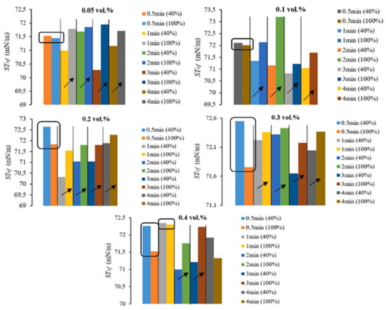 Recently, the influence of sonication amplitude (40% and 100%), sonication time (0.5–4 min), and volume concentration (0.05–0.4 vol%) on the surface tension of ZnO/DW NFs were examined [176]. The following two parameters are considered: surface tension and relative surface tension of NFs. Owing to statistical analysis, sonication amplitude is noticed to have a significant difference in both parameters, while sonication time has a pronounced effect on the relative surface tension, while volume concentration has a significant difference on the surface tension (see Figure 16).