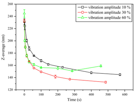 The stability via sedimentation and κ of MWCNT/EG NFs under the influence of sonication time (1–24 h) and volume fraction (0.05–2.5%) was examined [166]. An increase in the sonication time is observed to enhance the stability of the MWCNT/EG NFs as the particle size becomes smaller and the dispersion of nanoparticles improves. The settling time of the MNFs is noticed to increase as the volume fraction increases. The κ of the MNF enhances as the sonication time and volume fraction increase. The impact of sonication time (0–180 min) on the stability and μ of 0.5 wt% Al2O3/DIW NF was studied [167]. The results prove that an increase in the sonication time from 30 to 60 min causes an enhancement in μ, which diminishes as the sonication time is increased to 180 min. The ZP is noticed to increase as the sonication time increases, while the reverse is the case for the average cluster size and particle size. This reveals that the stability of 0.5 wt% Al2O3/DIW NF is enhanced with an increasing sonication time. The stability and rheological behavior of 0.5 wt% Al2O3/DIW NF under an increasing shear rate (36.7–305.7 s−1) and sonication (1–5 h) were examined [165]. They demonstrated that the stability improvement and reduced μ are noticed with an increase in the sonication time. A Newtonian behavior is observed at lower shear rates (36.7–170 s−1) depending on the temperature. With an increase in the sonication time, consistency indices of the MNF reduce slightly, while no specific trend is observed for the flow behavior indices.