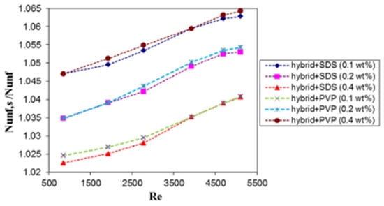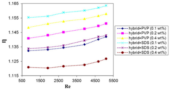 The influence of different surfactants (SDS and PVP), sonication time (0.25–2 h), nano-size (13 nm and 20 nm), NF concentrations (0.1–2.5 vol%), and surfactant mass fractions (0.25–4 wt%) on the stability and κ of DIW-based αAl2O3 NFs was studied [158]. The results demonstrate that the utilization of PVP to formulate the NF exhibits better stability than SDS even after 48 h of preparation. For both surfactants, κ reduces drastically, as the mass fraction increases up to 1.0 wt%, after which a relatively constant κ is noticed when the mass fraction of the surfactants is increased further. The κ of αAl2O3 NF is observed to reduce after preparation, but it enhances with an increase in sonication time and volume concentration. After preparation, no significant difference in κ is observed for samples ultrasonicated for 1 h and 2 h. With the use of SDS and PVP, maximum κ is achieved at different optimum surfactant mass fractions for different volume concentrations, and the SDS is noticed to yield higher values of κ. The αAl2O3 NF with a nano-size of 13 nm exhibited higher κ than the 20 nm-based NF with optimal κ values at 0.5 wt% and 1.0 wt% for SDS and PVP, respectively.