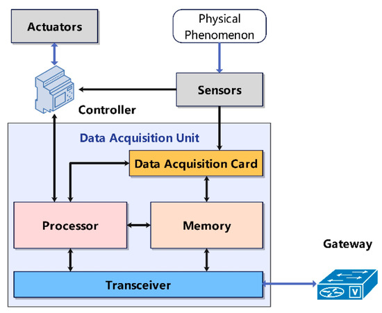 As is shown in Figure 2, wired data acquisition devices usually consist of a data acquisition card, processor, memory, and transceiver. The control data of the equipment can be obtained directly from the controller. Low-frequency sensing data can generally be collected by the controller, but high-frequency sensor data needs to be collected with a dedicated data acquisition card. In general, the data will be processed at the edge, and the processed data will be transmitted to the next layer through the transceiver. The data acquisition card, processor, memory, and transceiver are always integrated into a single device as a data acquisition unit.