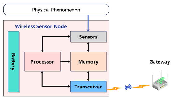 The architecture of the wireless data acquisition devices can be summarized from the above literature, as shown in Figure 3, including sensors, a processor, memory, a wireless transceiver, and a battery. These components are integrated into a single device, commonly referred to as a wireless sensor node.