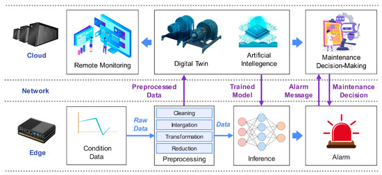 From the above studies, a general edge intelligence architecture can be summarized, as shown in Figure 4. The raw data are preprocessed at the edge, and the results are sent to the cloud. In the cloud, the preprocessed data can be applied directly to remote monitoring and maintenance of equipment, as it can also be used to train machine learning models. The trained model can be deployed at the edge for inference of anomalies and consequently signaling an alarm.