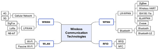 Although wired communication has the advantage of high reliability and low latency in the industry, there is still a place for wireless communication methods. Wireless communication methods are often used in environments where wiring is extremely hard, such as hazardous areas, moving equipment, etc. [68]. Figure 6 demonstrates the popular wireless communication protocols.