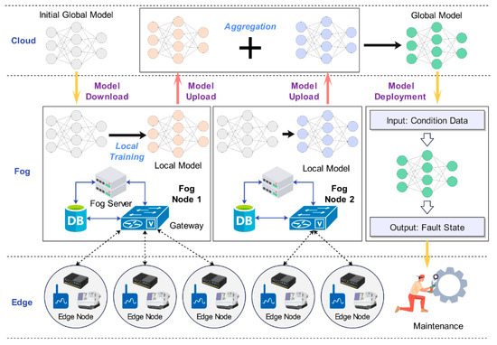 A fog computing framework fusing federated learning can be summarized from the above literature, as illustrated in Figure 8. The raw data are collected from the devices at the edge, and the collected data can be preprocessed or transmitted directly to the fog nodes. In the fog node, the initial global model is first downloaded and then trained locally. The local model in each fog node will be transferred to the cloud after training. In the cloud, the local models from each fog node will be aggregated to generate a new global model, which can be deployed to the fog node for equipment maintenance.