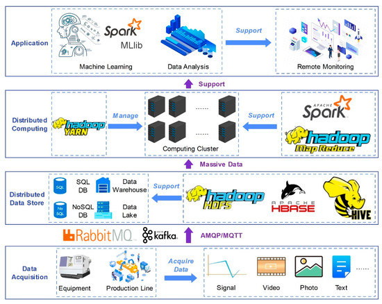 The above literature shows that big data computing frameworks mainly address the problem of distributed storage and computation of massive amounts of data, as shown in Figure 9. The enormous amount of data collected from the equipment and production lines will be stored. The dominant distributed storage system is HDFS. The data are then processed on the computing cluster with Hadoop MapReduce, Spark, and other computing engines. They employed machine learning, data analysis, and other approaches to monitor equipment and production lines remotely.