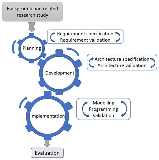 Methodology used in this work to develop and validate virtual environments. The foundation for planning is based on published results in the field and close collaboration with the industry. In the planning phase, requirements for the system are defined. Based on the specification, the system architecture is developed and validated. During the iterative implementation, the system is built and validated for the final evaluation.