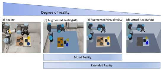 Reality–virtuality continuum. (a) real environment, (b) augmented virtuality, (c) augmented reality, and (d) virtual reality. The degree of reality decreases when moving from a real environment to virtual reality.