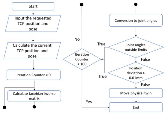 DTs provide the trainee with a way to interact with hardware connected to VEs. Each of the aforementioned digital robots has a physical counterpart and connection in between. DTs of the industrial robots are based on Unity3D Inverse Kinematics (IK). The inverse kinematics solution utilizes the Jacobian matrix to calculate joint values to achieve the requested TCP position. The forward kinematic solution utilizes Denavit–Hartenberg (D-H) convention. Publications presenting utilization of both forward and inverse kinematics calculations for various robot arms are available [,,,] and are used as a basis for the solution presented here. Figure 9 presents the inverse kinematics logic utilized in this work. The rigging of the industrial robot mechanics was created with Blender and imported into Unity3D along with model files. The rigging was utilized in Unity3D to create a kinematic model to bind robot arm mechanical elements together with constraints equivalent to the physical robot. IK calculations are based on the model, preventing moving the robot to non-wanted or out-of-reach positions. The table and walls surrounding the physical robot were also created in Unity3D and defined as physical barriers, limiting the robot’s movement inside these barrier elements. DTs presented enable three levels of integration with physical twins: digital model, shadow, and twin. The trainee can select between the three levels of integration for the DTs, utilizing the XR interface.