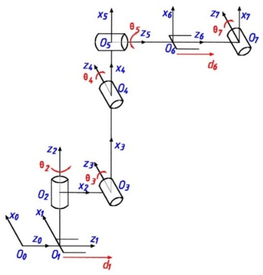 The base of the robot is connected to the pedestal through joint #1, which makes the robot capable of moving as a whole in the direction of the axis of the sprayed workpiece to realize the spraying of the whole surface of the sprayed workpiece. The base is connected to the waist through joint #2, which controls the robot’s swing in the lateral direction. The waist is connected to the main arm through joint #3, and the main arm is connected to the forearm through joint #4. Joints #3 and #4 are two rotation joints with their axes parallel and which control the angle of pitch of the main arm and forearm respectively. Joint #5 on the forearm controls the rotational movement of the forearm around its own axis. Joint #6 controls the telescopic movement of the forearm, which can increase its working space and flexibility without increasing the size of the robot. The spray gun is installed at the terminal of the forearm, and the direction of the spray gun is the same as the axis , so joint #7 can control the angle between the pointing direction of the spray gun and the axis of the forearm. Joints #5 and #7 are two rotation joints with axes perpendicular to each other, which can ensure that the spray gun points in any direction in the space.