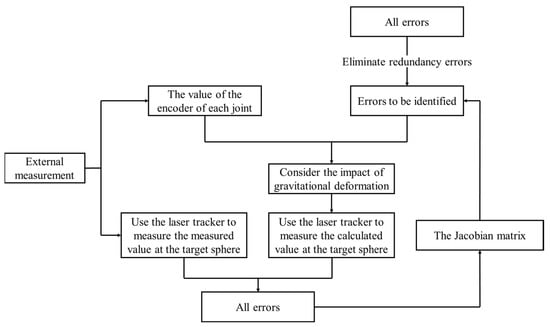 Since the redundancy errors will reduce the identifiability of errors, the redundancy errors need to be eliminated. Khalil [] screened and eliminated redundancy errors by analyzing the correlation of errors between adjacent joints. The measurement method dramatically affects the efficiency and accuracy of the calibration. A variety of devices [,,,] have been used for the measurement of terminal errors. Laser trackers with an extensive measurement range, high accuracy, and good flexibility are more suitable for measuring large-sized robots with high posture flexibility. Parameter identification is the process of using identification algorithms to solve the error model parameters based on the measured data, and the least square method [,], maximum likelihood estimation [], and genetic algorithms [,] are used in the parameter identification process. Patel [] obtained the error sensitivity of Hexapod by approximate linear error mapping and eliminated redundant parameters based on the obtained error sensitivity. Additionally, for error models with complex covariance between parameters, the least squares method faces the problem of unstable identification. The regularization method [,] is an ideal identification algorithm with high robustness. Error compensation is the last step in the calibration of geometric parameters. In this step, the identified errors are compensated into the robot control model, improving the robot terminal accuracy.