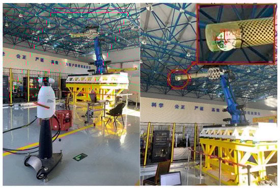With the rapid development of aviation and spacecraft industries, large-sized aero- and spacecraft production is gradually increasing. Their surface is usually protected from erosion and heat by special coatings [], with thickness and uniformity satisfying stringent requirements []. Compared to manual operation, robot spray painting is more stable, high-efficient, and uniform, and thus has a higher coating quality, making automated painting a vital development direction [,]. With the advantages of good dynamic characteristics, increased flexibility, high acceleration, ample working space, and the ability to keep the spray gun perpendicular to the painted surface and avoid obstacles, a hybrid robot with seven degrees of freedom (7-DoF) [,] is a lucrative choice for the spray painting of large-sized airplanes and rockets.