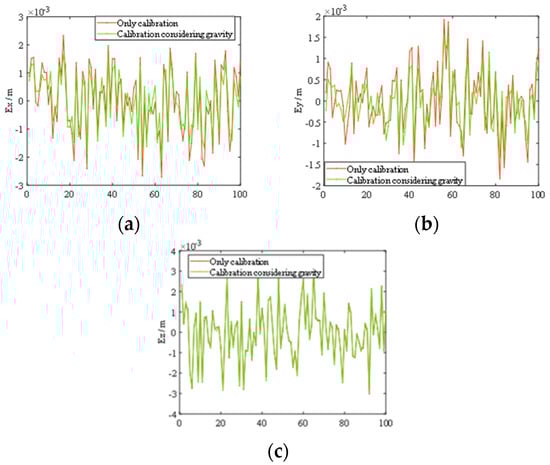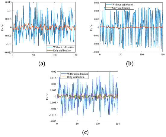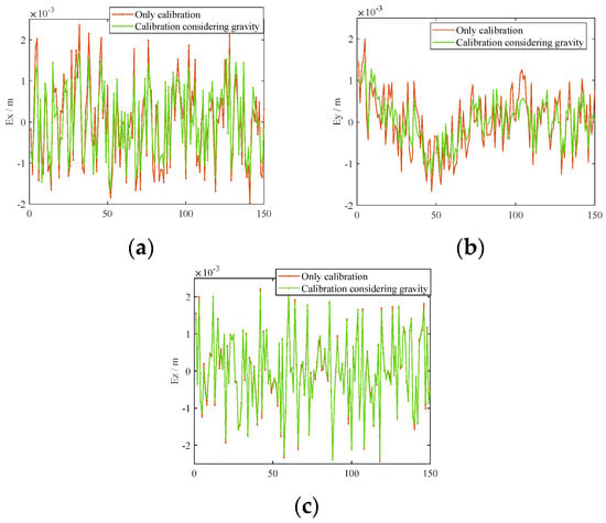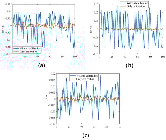 For calibration only without considering gravitational deformation, the compensated error and the uncalibrated error of each measurement point were compared using the identified data, as shown in Figure 14.