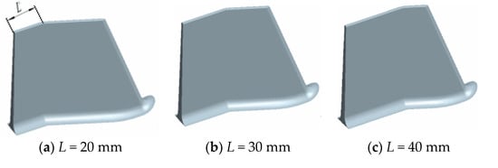 A vortex pump vane has a straight vane, bent vane, and a slanting vane of three kinds. The slanting vane can limit the fluid from a radial to an axial circulation flow and reduce the circulation loss, and the efficiency and head of the vortex pump improve to a certain degree; therefore, the slanting vane is the most widely used vane form [21,22,23,24]. This paper took the IS 125-80-230 (LXH) vortex pump as the object of study, with the specific parameters shown in Table 1. The vortex pump is a kind of R30-F30 vane vortex pump; R30 refers to the same direction of the rotation with an impeller slope angle of 30°, and F30 refers to the opposite direction of the rotation with an impeller slope angle of 30°. The second inclined section length (L) of the blade indicates the position of the bending point of the inclined blade to the distance at the impeller outlet. The R30-F30 blade was modeled in the research process for the three cases of L = 20, 30, and 40 mm, and the vortex pump blade structure is shown in Figure 1.
