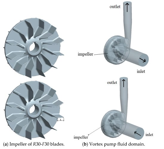 Vortex pumps are a special type of centrifugal pump with good nonclogging properties due to the fact of their semi-open impeller structure [1,2]. Compared to other vane pumps, vortex pumps are more prone to cavitation [3], which can lead to violent impacts on the impeller [4] and damage to the impeller surface material [5,6]. Designing a highly adaptable and efficient vane form under the premise of ensuring the cavitation performance of the vortex pump has been an area of great interest in vortex pump research. For example, from the vortex pump impeller blade parameters, Svoboda et al. [7] found that the width of the impeller blade on the vortex pump pressure and efficiency had a greater impact. Gao et al.’s [8] research on the impeller blade wrap angle found that when the wrap angle was reduced, the vortex pump’s efficiency increased. To improve the cavitation phenomenon of the pump and increase the operating stability, Huan et al. [9] increased the pressure to reduce and inhibit cavitation at the impeller inlet by installing an induced wheel, and Kondić et al. [10] added vortex rings to the back of the centrifugal rotor, which could help reduce cavitation in the centrifugal pump. Cheng et al. [11] found that changes in the specific area of the balance bore caused changes in the centrifugal pump dust lifting and efficiency, and this provides an idea for improving the cavitation resistance of the pump. Ye et al. [12] used a kriging approximation model to establish the relationship between the vortex pump geometry parameters and the vane efficiency and erosion rate, which provides a more reliable method for studying the optimization of the cavitation characteristics of a vortex pump. Ju et al. [13] proposed an angular vane design, and compared with traditional radial straight vanes, two- and three-dimensional angular vanes can improve the hydraulic performance of a vortex pump in terms of the efficiency and head.