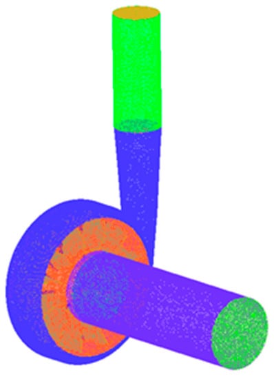 Before the numerical simulation calculation of the cyclonic pump, the fluid domain of the cyclonic pump must mesh. In this study, ICEM was chosen as the software for meshing, which is able to interface with Pro/ENGINEER and also to automatically span geometric defects and some redundant minute features. For the relatively complex pump body and impeller in the vortex pump, a tetrahedral mesh is a feasible choice for delineation. For the inlet and outlet pipes, the structure was simple; thus, it can be divided by hexahedral meshing. The overall meshing of the vortex pump is shown in Figure 3.