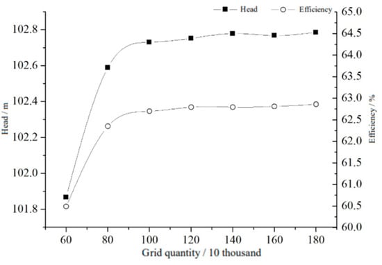 The form and number of meshes have a relatively large impact on the results of numerical simulations. To balance the accuracy of the numerical simulation and the speed and efficiency of the calculation, the grid needs to be irrelevant [25]. As shown in Figure 4, the head, shaft power, and efficiency of the vortex pump are stable when the number of grids for a model pump is greater than 1.4 million, and its error does not exceed 0.5%. Since a grid number of 1.8 million is low and most computers are now able to calculate quickly and efficiently, the total number of computational grids for the model pump was 18,066,545.