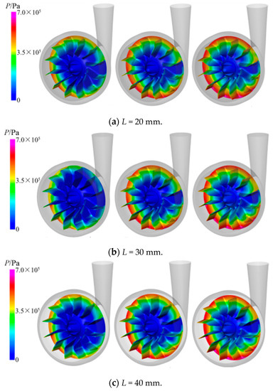 The pump’s internal (P) distribution of the different L values under the three cases of inlet total pressure are shown in Figure 5. The three cases of inlet total pressure were Pin = 3, 6, and 9 × 104 Pa, shown from left to right. As shown in Figure 5, the static pressure from the impeller inlet to the outlet of the vortex pump increased gradually, and the inlet of the impeller was the lowest pressure region. The low-pressure region of the impeller was not evenly distributed, and the area in the 3 o’clock direction of the vortex pump impeller, due to the tongue, was a relatively low-pressure region in the whole flow passage. When the fluid flowed through the tongue, it caused a certain pressure pulsation; thus, the low-pressure regions were likely to have cavitation. With the increase in the total inlet pressure, the static pressure at the same position of the impeller of the vortex pump increased gradually, and the strength of the cavitation could be suppressed. When the total inlet pressure was large enough, the cavitation could be avoided. Comparing the three kinds of blades (i.e., L = 20, 30, and 40 mm), when L = 40 mm, the low-pressure region was larger than for L = 20 and 30 mm, and the low-pressure region spread to the second inclined part of the blade. If the fluid in the low-pressure region vaporized and flowed forward, it would sharply reduce and rupture when achieving the high-pressure region, causing a water hammer impact on the wall. Therefore, the probability of the occurrence of cavitation with the L = 40 mm blade was greater than for the other two cases. When L = 20 mm, the low-pressure region of the whole flow passage was significantly smaller; thus, it can be seen that a shorter L value can improve the impeller distribution of the impeller flow passage and reduce the low-pressure region inside the pump impeller. The reason for this is that when the L was shorter, the first inclined part length of the blade increased, and its ability to work on fluid became stronger and enhanced the anti-cavitation ability of the vortex pump.