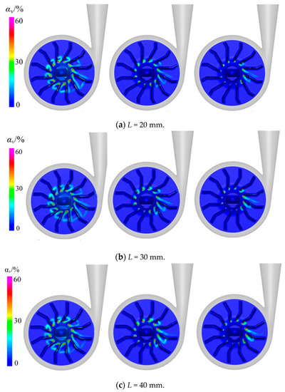 The internal flow field (αv) distribution of the pump with different L values under the three cases of inlet total pressure.