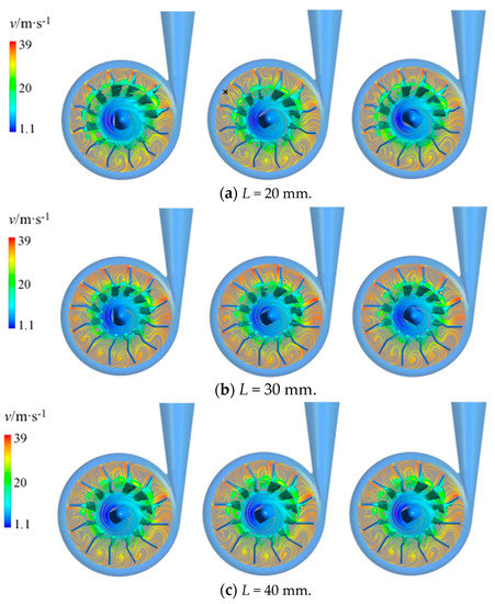 When the inlet total pressure was Pin = 3 × 104 Pa, the streamline and bubble distribution of the vortex pump with the different L values are shown in Figure 7. Due to the cavitation phenomenon of the vortex pump changing periodically, the impeller was divided per rotation into three time points for analysis; an internal flow field chart of the vortex pump every 120° was analyzed, as shown in Figure 7, from left to right, with the 0/3, 1/3, and 2/3 cycles. The impeller bubble volume fraction of the isosurface, as shown in Figure 7, was 0.3, and the streamlines were located in the middle section of the impeller.