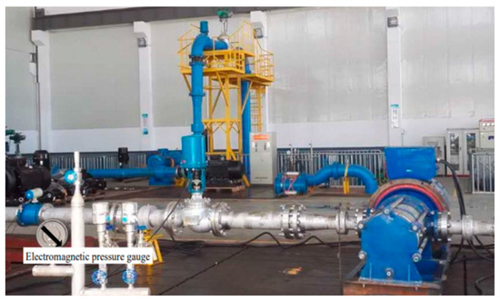 A vortex pump cavitation test system was used to test the cavitation characteristics of the vortex pump. Using an open test bench, the design of the test bench was in line with national standards (GB/T3126), with a B-level accuracy. The test site diagram is shown in Figure 8. An orifice flow meter was used for the pump flow measurements, a torque sensor was used to measure the shaft power of the pump, and a standard pressure gauge was used to measure the pressure at the inlet and outlet of the vortex pump. The fluid pressure distribution at the inlet and outlet of the vortex pump was measured with an electromagnetic manometer during the experiment, and the sensor was located at the inlet and outlet positions of the vortex pump. During the test, the pressure, flow, torque, and speed of the inlet and outlet of the vortex pump were measured, where the integrated error of the test system was 0.86%, and the cavitation condition of the test pump was produced by changing the pressure at the impeller inlet. The predicted value for the L = 30 mm vortex pump was taken in comparison with the test value to verify the credibility of the simulation results.