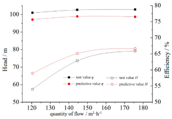 The vortex pump test flow–head curves and flow effectiveness curves are shown in Figure 9. As can be observed, the tendency of the numerical simulation results basically agreed with the experimental results. The numerical simulation value of the head was slightly higher than the test value, while the value of the efficiency was lower than the test value. Under different conditions, there was a difference of approximately 5% between the numerical simulation value for the head and the test value; although the efficiency had a larger fluctuation, in the case of a small flow, the gap between the test value and the simulation value was larger, and the difference was 5%. With the increase in the flow rate, the efficiency value of the test value was close to the simulation value, which was similar than the prediction trend.