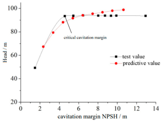 The relationship between the cavitation margin and the head of the vortex pump is shown in Figure 10. It can be observed that the change tendency of the predicted value and the test value basically coincided. The difference between them was that the predictive head decreased slowly with the decrease in the cavitation margin, but the test value was basically unchanged before the critical cavitation margin, and it was very stable. The common feature was that when reaching the critical cavitation margin, the head of both the test value and predictive value declined sharply. Overall, the results of the numerical simulation accurately reflected the cavitation performance of the vortex pumps and had a certain reliability.
