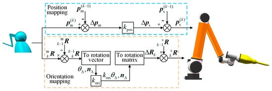 The master–slave mapping of the OSRS includes position mapping and orientation mapping. The position and orientation of the master controller can be obtained from the phantom’s API. Both position mapping and orientation mapping are incremental, which means the master controller’s increment is mapped to the slave manipulator by a scaling factor. For position, the mapping is shown in Equation (1).