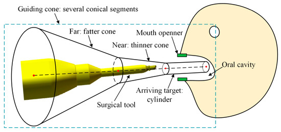 As shown in Figure 4, the guiding cone consists of several conical segments connected together. When the tool is far from the target, the guiding cone is fat and has a larger free space. When the tool is closed to the mouth, the guiding cone becomes thinner, and the motion is gradually constrained. When the tool approaches or reaches the target, the guiding cone shrinks into a cylinder which totally limits the position and orientation of the surgical tool. This design provides a certain free space for manual operation and constrains the undesired motion, which is in accordance with the geometric conditions of oral surgery. Besides, the guiding cone can not only constrain the position of the surgical tool, but also can correct the orientation, which is essential for accurate positioning.
