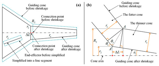 The surgical tool is similar to a cylindrical rod, and different tools have different radii. In order to efficiently calculate the position relationship between the tool and the guiding cone, the tool (cylinder) should be simplified into a line segment. To do this, the guiding cone needs to shrink the radius of the tool inward, as shown in Figure 5a. It can be seen that the connection point of two adjacent cones moves backward by , and the radius of the connection of two adjacent cones shrinks from to . The geometric relationship of the shrinkage is shown in Figure 5b by which the parameters and can be obtained as shown in Equations (5) and (6). After radius compensation (shrinkage), the surgical instrument is simplified as a line segment, which brings convenience to the calculation of the position relationship described later. In the subsequent discussion on the virtual repulsive force and the effect of the guiding cone (Section 3.2 and Section 4), it is assumed that the end effector is simplified into a line segment and the guiding cone is shrunk inward by the radius of the surgical tool.