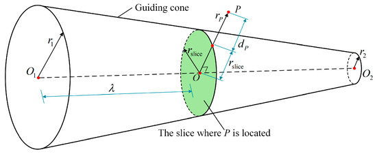 where is the ratio of the slice where point is located to the height of the cone, is the distance point exceeds the guiding cone, represents the length of OP which is the distance from to the slice center , is the radius of the slice, and and are the two radii of one segment of the guiding cone.