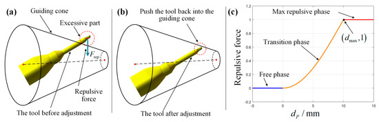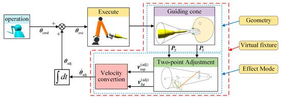 where represents the joint angle command from the master–slave operation. Thus, the effect of the guiding cone is established, and the diagram of the adjustment effect is shown in Figure 11. From Figure 11, it can be seen that design of the guiding cone and the adjustment effect form the complete proposed virtual fixture framework.