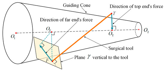 For the repulsive force, after the magnitude is discussed in Section 3.2, the direction will be defined here, as shown in Figure 9. For the repulsive force of the top end , in order not to interfere with the motion along the guiding cone axis , the direction vector is toward the slice center (along vector ), and the component along the guiding cone axis is 0. For the repulsive force at the far end of the surgical tool, its direction vector is defined in plane that is vertical to the surgical tool (line segment ), so that the component along the tool direction is 0. Following that, the direction of the repulsive force at the far end is defined as the projection vector that vector projected on plane , where vector is from the far end to the corresponding slice center .