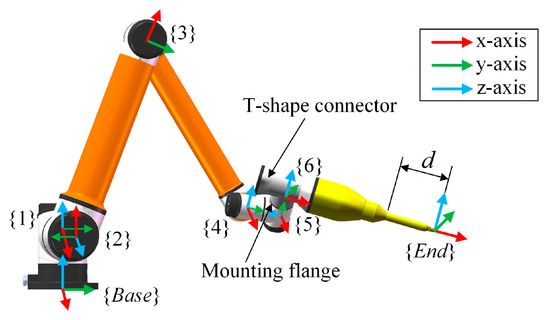 As the second part of the guiding cone’s effect, the velocity conversion is a process that converts the adjustment velocity of the surgical tool obtained in Equation (13) into the joint space of the manipulator which is the plant to directly perform the motion. First, we used the Denavit–Hartenberg method to build the forward kinematics model [42]. The coordinate systems of the joints are shown in Figure 10, where a T-shape connector is used to mount the surgical tool on the mounting flange, and a coordinate system is fixed on the top end of the tool. The forward kinematics is expressed in Equation (14).