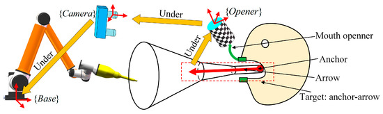 The guiding cone can be determined by “anchor-arrow” description: an anchor point and an arrow (3D vector) represent the position and orientation, respectively. The “anchor-arrow” description is preoperatively defined under the mouth opener’s local coordinate system whose transformation to the camera’s coordinate system can be obtained from the vision system. To convert the “anchor-arrow” description from the mouth opener to the manipulator, the hand–eye calibration result is necessary. The correction of the guiding cone is shown in Figure 13, Equations (24) and (25).