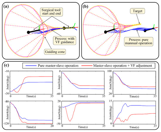 The first simulation group is “static and manual” feeding, that is, the guiding cone is fixed, and the motion is generated by master–slave motion. This group is to verify the adjustment effect, in other words, to check whether the guiding cone can play its role. The results are shown in Figure 15, including the motion process (see Figure 15a,b) and the joint space’s angle (see Figure 15c). The results of the virtual fixture are activated and deactivated (only master–slave command is allowed) are displayed, forming a comparison.