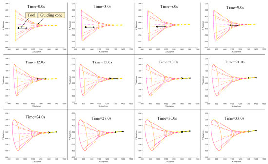 The second simulation group is “dynamic and manual” feeding. In this group, position and orientation of the guiding cone are changing gradually, representing the disturbance of the oral cavity. The original motion command is generated by master–slave operation. When time is 0 s, under the “anchor-arrow” description, the guiding cone’s anchor point is and the arrow vector is . When time is 7.5 s, the anchor point is and the arrow vector is . The motion process of the tool subjected to a dynamic guiding cone is displayed in Figure 16, from which it can be seen that the surgical tool can still track the guiding cone well and hit the target, although the guiding cone is ever-moving.
