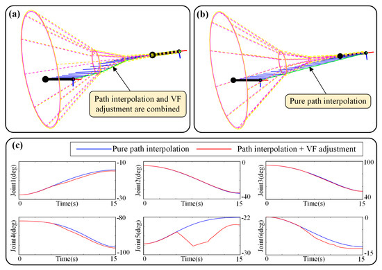 Simulation of “static and automatic” feeding: (a) Motion process when path interpolation and VF adjustment are combined; (b) Motion process when VF is deactivated, which is pure path interpolation, and the VF is exceed; (c) Angle–time curves of joint space.