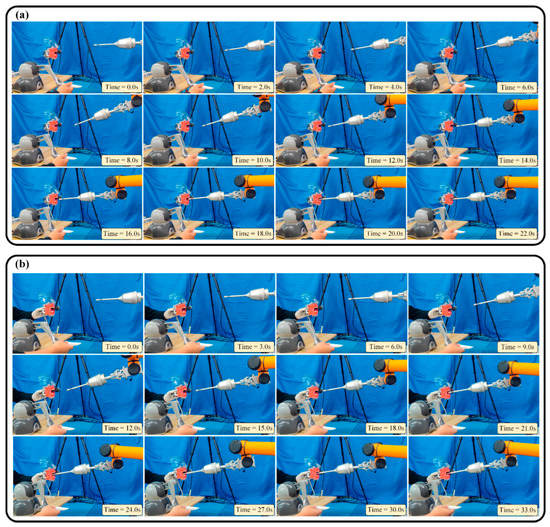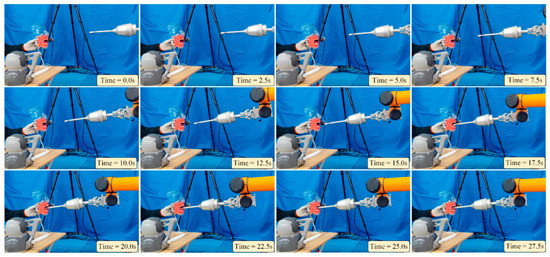 Experiments are conducted with the following three groups: static and manual feeding, dynamic and manual feeding, and dynamic and automatic feeding. The motion process of the three groups is shown in Figure 19a,b and Figure 20, respectively.
