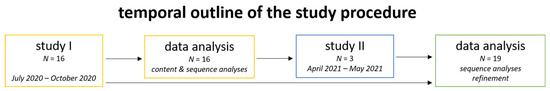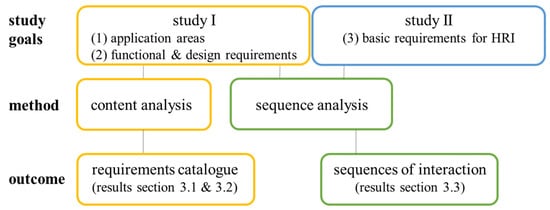 The data collection and evaluation procedure were carried out consecutively. A temporal outline of the study procedure is presented in Figure 2. First, study I was conducted. Based on the results of study I, study II was conducted. The results from study I and II were used in combination for the creation and refinement of specific sequence models for HRI. The entire data collection ran from July 2020 to May 2021.