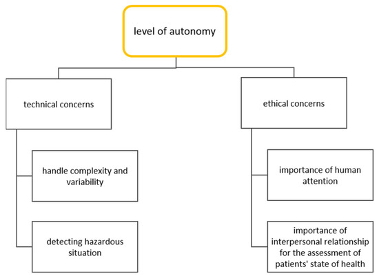 Overview of the technical and ethical concerns related to the automation of care activities as well as the level of robot autonomy.