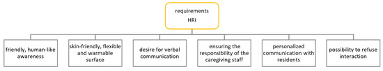 In this section, we present our findings on the design requirements for HRI from the perspective of health professionals (see Figure 6). A first set of requirements refers to the external design and appearance of a robot. In the context of promoting acceptance and use, a robot should have a friendly and not frightening appearance. A human-like, infantile design was also evaluated positively, as this can contribute to the promotion of acceptance in the target group of residents (especially according to the view of the interviewees with robotics experience): “I do think that the inhibition level decreases when it’s a little bit human.” (Int-Q/nurse). Another design requirement concerns the surface. For the purpose of direct physical contact between robots and humans (e.g., for mobilization), the surface should be skin-friendly, provide a certain degree of flexibility and be suitable to be warmed up to body temperature. It was emphasized that, especially in the context of mobilization of physically impaired care recipients, technical assistance systems can cause a negative self-perception. An essential requirement would, therefore, be to reduce the machine-like character of the robot through the design in order to promote a positive perception of the physical contact between the robot and the care recipient: “Maybe it should also not be rigid, that it really feels like being lifted by an arm. That it is not something rigid, where the patient has the feeling that it is a machine that is doing it.” (Int-J/nurse).