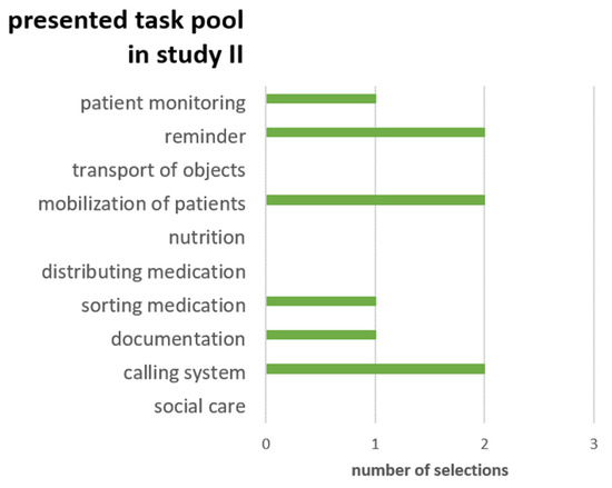 For study II, participants were informed about the purpose and procedure of the interview via e-mail. If necessary, any questions that arose were also answered by telephone. After formal consent, participants received a link for the online interview. This time, Zoom was used as conference service tool, and no recordings of the interviews were made. First, a general introduction into the to-be-applied method of sequence analysis and objectives of this approach was given. Next, ten potential tasks for robotic support in healthcare were presented (based on study I, see Figure 7). Out of the ten, the three most important tasks should be selected for robot deployment. The selected ones were discussed in-depth. During the interviews, one interviewer and one transcript writer attended. Both had the opportunity to ask follow-up questions. To support the interviews visually, Miro—an online collaboration platform—was used. The interviews lasted approx. 60 min (SD = 8 min; min = 55 min; max = 70 min). Participants were compensated with 15€.