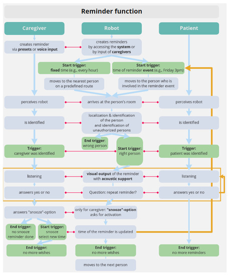 Robots should remind people about upcoming events or tasks. This reminder function (see Figure 8) should include care recipient-related (e.g., drinking reminders, reminders for doctor visits, or when to take the medicines) and healthcare professional-related events (e.g., pharmacies orders, appointments, or special medication dispensing). A repeated reminder was perceived as positive because often information gets lost in the stressful daily routine. A function to acknowledge the reminder when the according task is done was therefore felt to be useful. This function was only desired for the healthcare professional-related reminders and is, therefore, only located on the left column in Figure 8. With regard to requirements for the concrete input and output of such reminders, i.e., how should the appointments be entered into the robot and how should the reminders be displayed or expressed to the respective interaction partner, interviewees stated that a reminder is only helpful if it does not cost additional time or resources. For that reason, it was desired that the robot should retrieve the appointments and reminders directly from the existing electronic data processing system (EDP system). The robot should, therefore, not operate separately from existing systems but be integrated into the existing infrastructure. Reminders that arise at short notice or are not retrievable from the existing system (e.g., visit of a patient’s daughter in the afternoon) should either be selectable via presets or implemented via voice input. One important aspect was that the creation of additional reminders can only be done by healthcare professionals. For this reason, an additional interaction between the healthcare professional and the robot is added in Figure 8 before the sequence begins with the start trigger. With regard to the output, the content of the reminder was of major importance. In general, a visual representation was desired. This could be done on the robot or projected from the robot onto the wall. Additional end devices to which the reminders are sent were also conceivable. In the case of relevant reminders, an additional acoustic signal or a voice output should be integrated to reflect the higher relevance. However, data protection must be maintained in the case of sensitive information. In the patient’s room or in the presence of other persons who are not authorized to receive the information, the acoustic output should be disengaged. Face recognition is seen as a prerequisite for such personalized reminder outputs, which was deemed acceptable by the interviewees for this purpose.