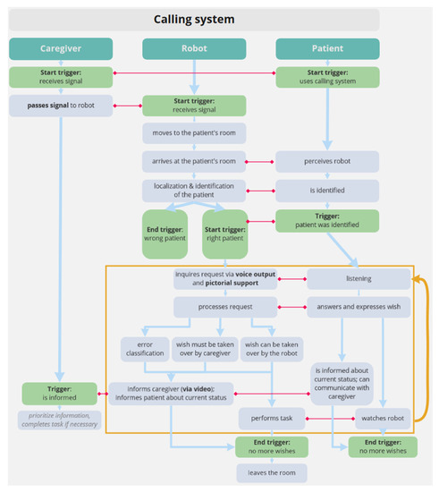 The calling system is an elementary component in retirement and nursing homes. Residents can ring a bell to call a healthcare professional when they have a wish or an emergency. The detailed sequence for the calling system is illustrated in Figure 9. One important aspect by the integration of the robot is the coupling of the robot with the existing calling system as differentiating between different buttons would be too difficult for many care recipients. When receiving a call, healthcare professionals can send the robot to check what the call is about. In this case, the healthcare professional is interposed between trigger (patient) and executor (robot). The chronological order of the interaction sequences in Figure 9 highlights the role of the healthcare professional. Optionally, the robot could make rounds at predefined times to take requests or check on patients. In this way, attention would also be paid to people who forget to use the calling system (e.g., because of dementia) or people who are physically limited. During the concrete interaction between robot and patients, all interviewees agreed that a combination of spoken and visual support is desired. A visual support of verbal communication is intended to lead to a better understanding and both hearing and visually impaired patients should easily interact with the robot. To pass information to the caregivers, a video call was perceived as a feasible option. However, feedback to the healthcare professionals was also desired when the task was carried out independently by the robot. For this, a text message, for example, would be sufficient. Regardless of the (non-) successful execution, it is important that the healthcare professional remains informed about the current status.