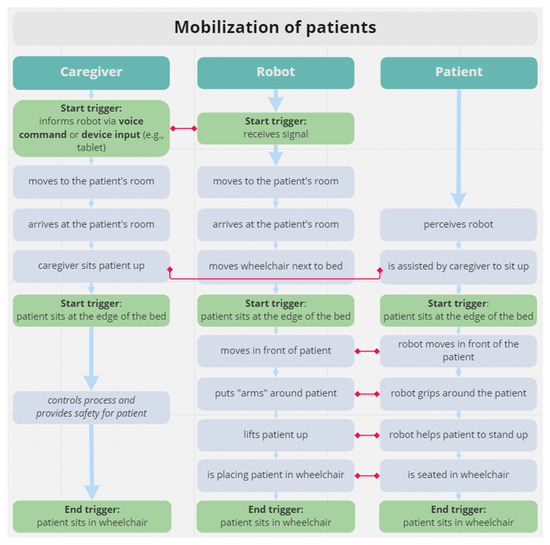 For mobilization of patients, two specific tasks were considered and discussed. One task for the robot was to transfer a patient from the bed to the wheelchair. The other was to transfer the patient from one place to another. Only the first example is illustrated in Figure 10. For both scenarios, we were at first interested in how these tasks are launched/started. Interviewees indicated that this depends on the presence or absence of a healthcare professional. If the robot and a caregiver are in the same room, a voice command is preferred; otherwise, calling the robot via tablet or a similar device is favored. However, commanding the robot can only be done by the healthcare professional. Since in mobilizing patients the robot is physically very close to the patients (e.g., robot sits the patient up or a patient leaning on the robot while walking), trust in the robot must first be established. In addition to an initial introduction in cooperation with the caregivers, verbal communication during the tasks is considered to promote trust. When transferring patients from bed to wheelchair, the caregivers stated a need to be present at all times to ensure patient safety (see Figure 10). In terms of accompanying patients, emergency situations, such as patient falls, were often addressed, as the caregivers would not be directly involved in these situations. In such situations, the robot should make a direct call to the caregivers and request help. Text messages in emergency situations are clearly rejected as they need a higher visibility.